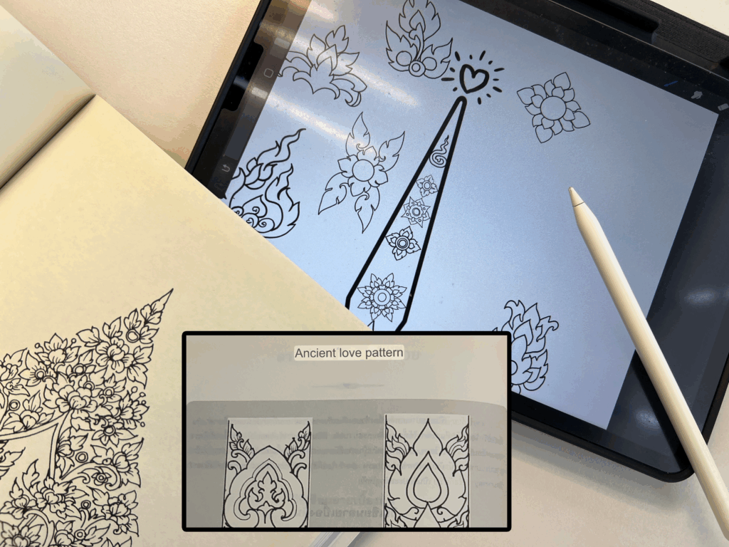 For this piece, I drew inspiration from traditional Thai art, symbols, and patterns. Since I’m in Thailand myself, it felt like the perfect time to immerse in its artistic traditions. While exploring books on Thai art, I was fascinated by how different it is from Western styles—especially the elongated hands and feet often seen in traditional drawings. If my translations were correct, I also discovered some beautiful old symbols representing love.