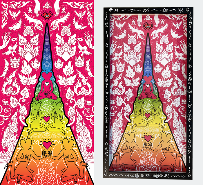 This artwork expresses love for life and gratitude. It has always been my dream to create art full-time, and being able to do this and share it with the world is something I deeply appreciate. Learning more about Thai culture through art and connecting with it here in Thailand feels like an important next step. I love discovering the meanings behind symbols humans use, and blending these cultural elements with my own pop style makes the process even more inspiring.